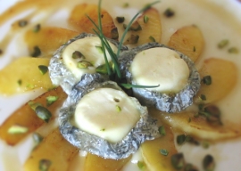 Pelez une pomme sans la couper et taillez 2 tranches épaisses (environs 2 centimètres) dans la partie la plus large du fruit. Faites-les ensuite dorer à la poêle. Puis, posez dessus le fromage de chèvre et mettez le tout au grill quelques minutes pour le faire fondre. Servez par exemple sur un lit de salade verte aux noix. Vous pouvez également ajouter un filet de miel sur le fromage (attention, la photo ne correspond pas au plat).