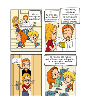 Cette petite a plus d’un tour dans son sac et son imagination nous fait souvent sourire. On plaint les pauvres parents qui doivent endurer tant de bêtises et de réflexions parfois assez perturbantes. Tant d’humour grinçant chez cette poupée rousse à couettes, c’est assez déstabilisant. Certaines situations sont déjà vues et manquent un peu d’écriture et les personnages secondaires manquent d’épaisseur mais les dessins sont sympas et Adèle très attachante. On passe un bon moment sur cette BD et je pense aller jeter un oeil aux autres tomes.