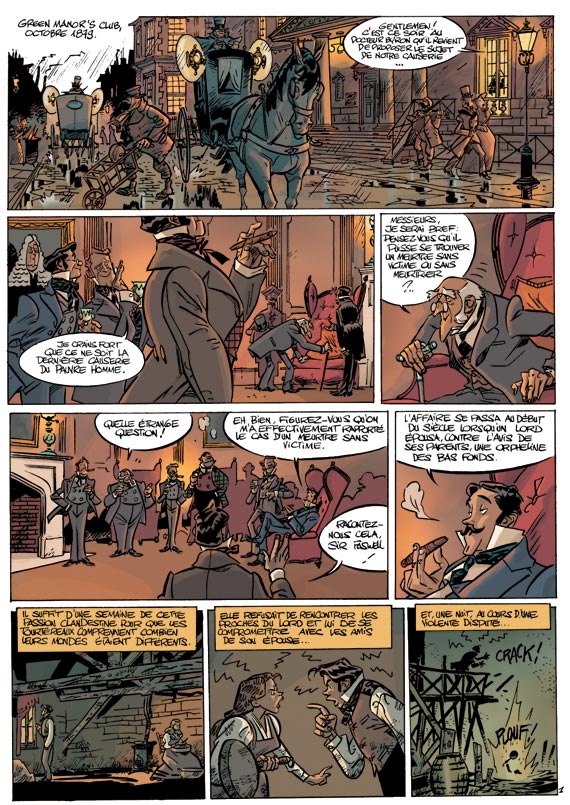 Ce très bel ouvrage compile l’intégrale de Green Manor, soit 3 tomes. La couverture est particulièrement réussie, avec un petit côté vieillot qui colle parfaitement au sujet : imitation cuir vieilli et papier de qualité se conjuguent en un très bel objet qui sera du plus bel effet dans votre bibliothèque. Mais bien sûr, cela ne saurait suffire. Et le contenu ? me direz-vous. J’y viens justement. J’ai également beaucoup apprécié le graphisme. J’ai souvent du mal avec les dessins très modernes, ici on reste dans un univers visuel plutôt classique qui retranscrit très bien le côté désuet mais plein de charme des lords anglais : un régal pour les yeux ! Quant aux 16 historiettes, elles sont autant de perles d’humour noir. Les intrigues sont très bien construites et chacune se démarque de ses consœurs, bien qu’elles aient bien sûr le Green Manor Club en partage.