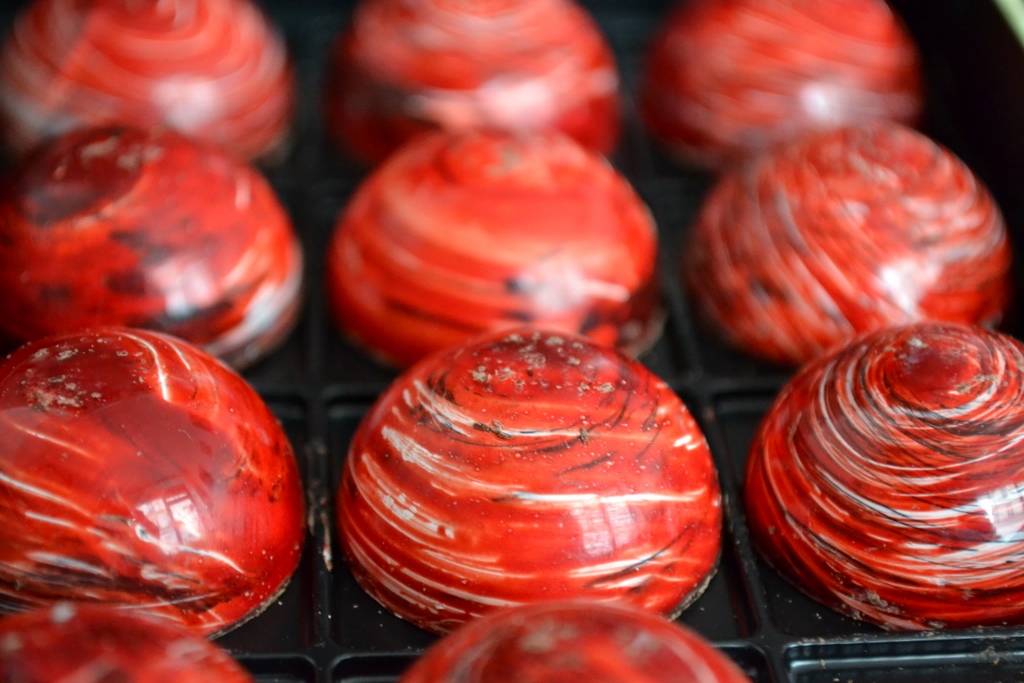 Ce roman m’a été envoyé dans le cadre d’un partenariat avec les éditions Flammarion (comme mes lecteurs assidus le savent, avec moi l’envoi d’un livre gratuit est pourtant bien loin de garantir une bonne critique !). Dans l’ouvrage, l’auteur invente un chocolat au goût de baiser : cacao et orange sanguine. Hugo et Victor, l’excellent duo pâtissier/chocolatier (dont je vous parlais ici), l’a réalisé pour l’occasion ! Et comme ils ne font pas les choses à moitié, les éditions Flammarion en ont envoyé une boîte pour accompagner le roman. Une fine coque en chocolat, un caramel d’orange sanguine et un coeur de meringue à la fleur d’oranger, le tout présenté dans les boîtes/carnets emblématiques de la marque. Un régal pour les yeux et les papilles ! Merci donc aux éditions Flammarion et à Hugo et Victor pour cette délicate attention ainsi qu’à Mathias Malzieu pour son roman qui se dévore comme une friandise.