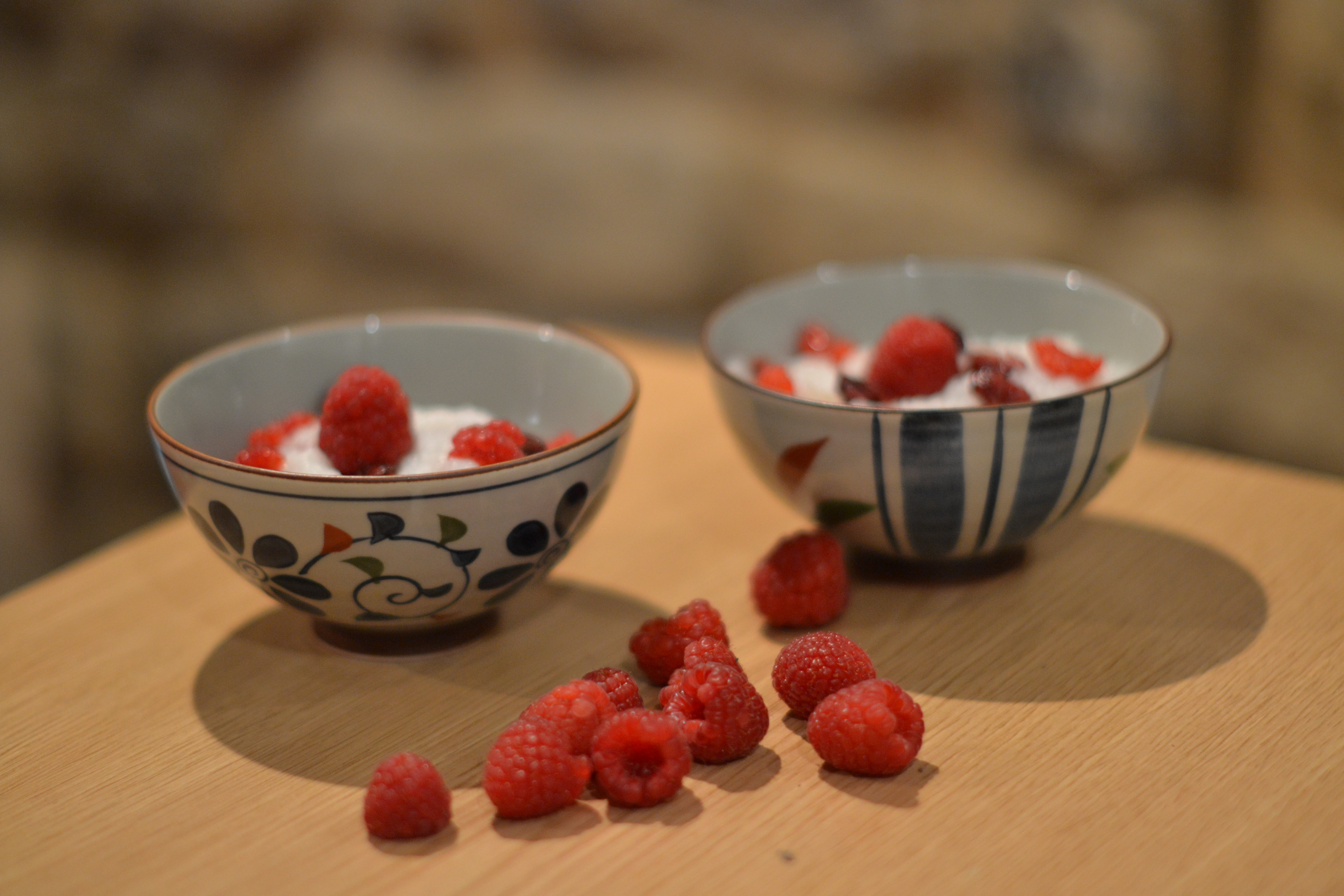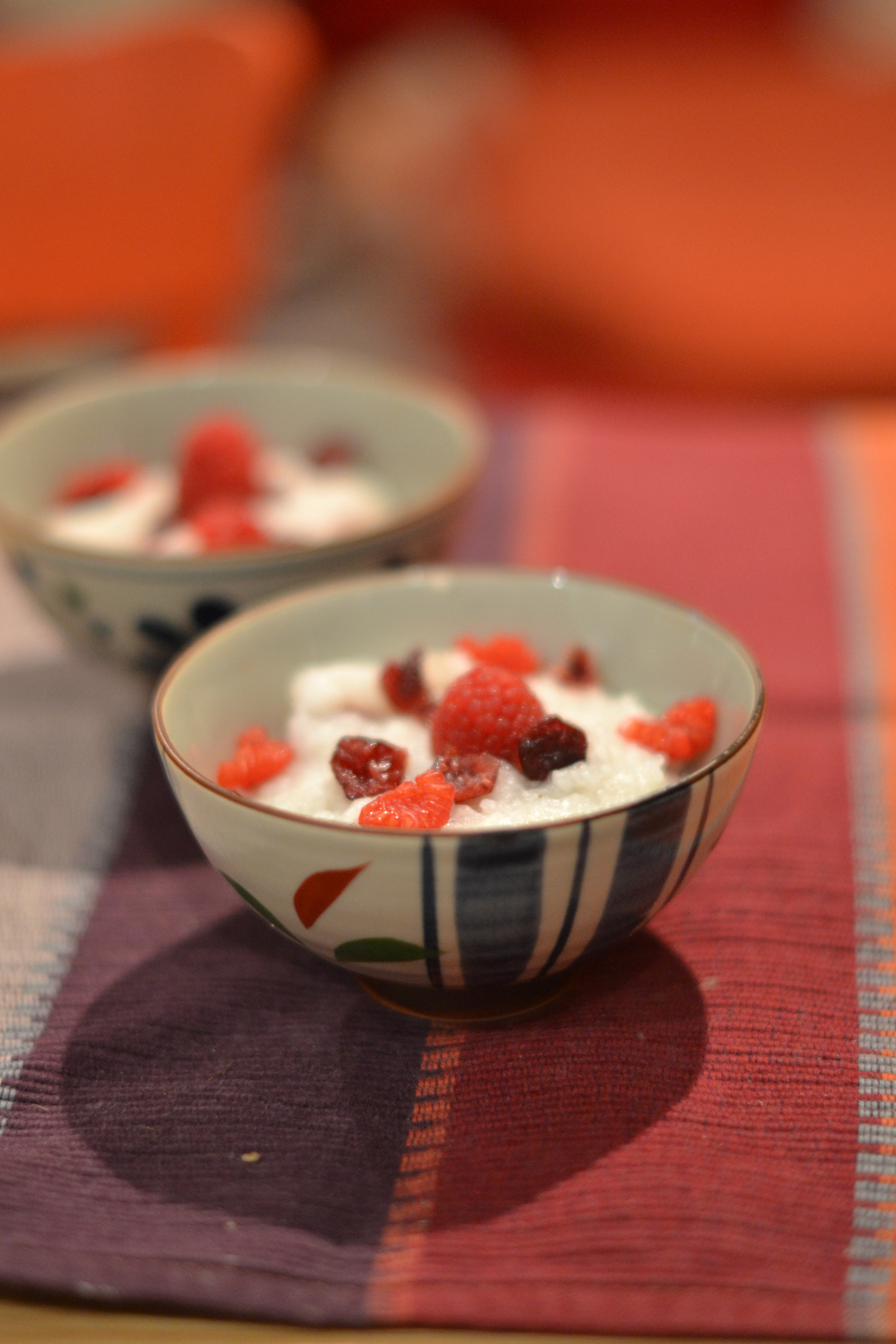Quand le tapioca est cuit (il devient alors translucide), répartissez-en la moitié dans des ramequins ou des petits bols en remplissant jusqu’à mi-hauteur. Disposez dessus les 2/3 des framboises et cranberries.