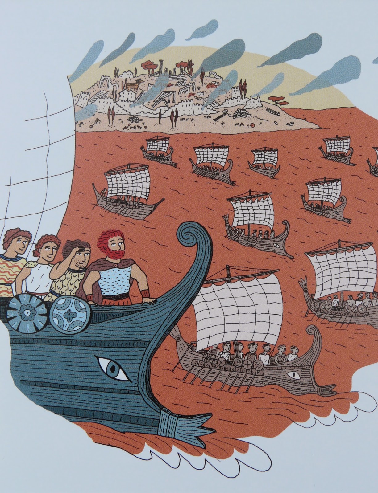 J’ai eu une petite déception en voyant le dessin, dans un style assez naïf que je n’apprécie pas particulièrement. Mais finalement, je m’y suis un peu habituée au fil de la lecture et je me suis surtout demandé si ça m’aurait gênée étant enfant. C’est vrai que c’est un type de trait que je n’ai jamais trop aimé mais je pense que j’aurais trouvé très secondaire ! Ce qui m’aurait intéressée, c’est l’histoire, et de ce côté-là, il n’y a rien à dire. Les passages sont très bien choisis et les aventures d’Ulysse sont racontées en peu de mots mais sans jamais omettre l’essentiel.