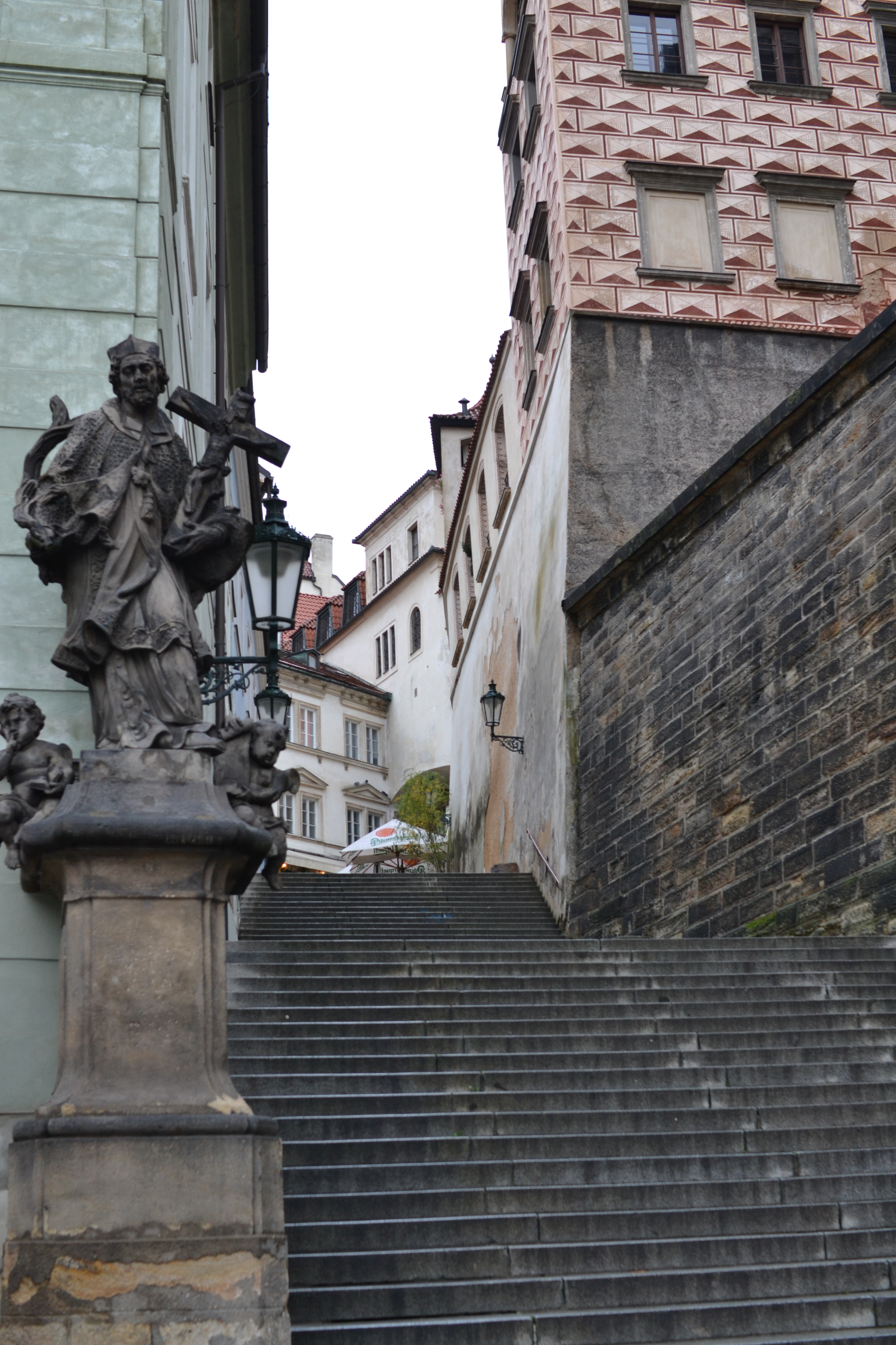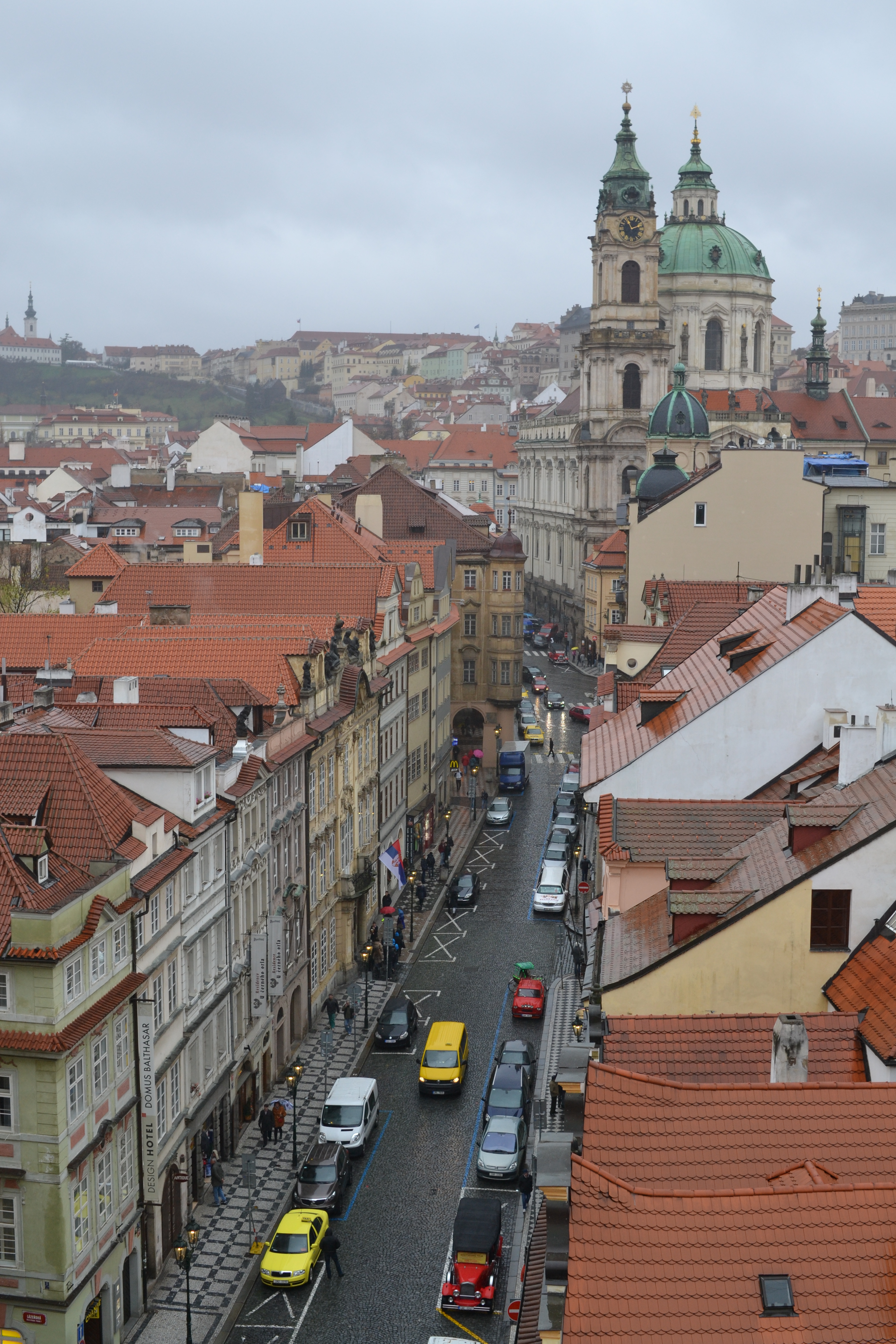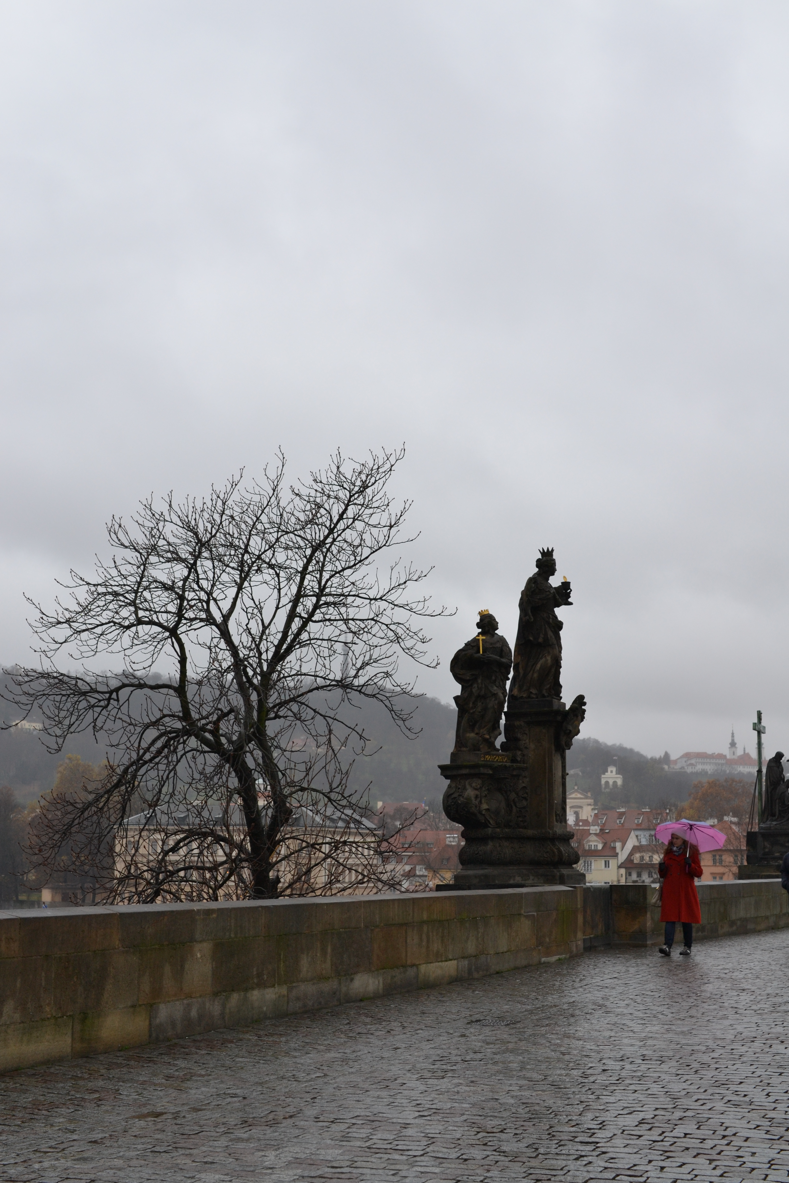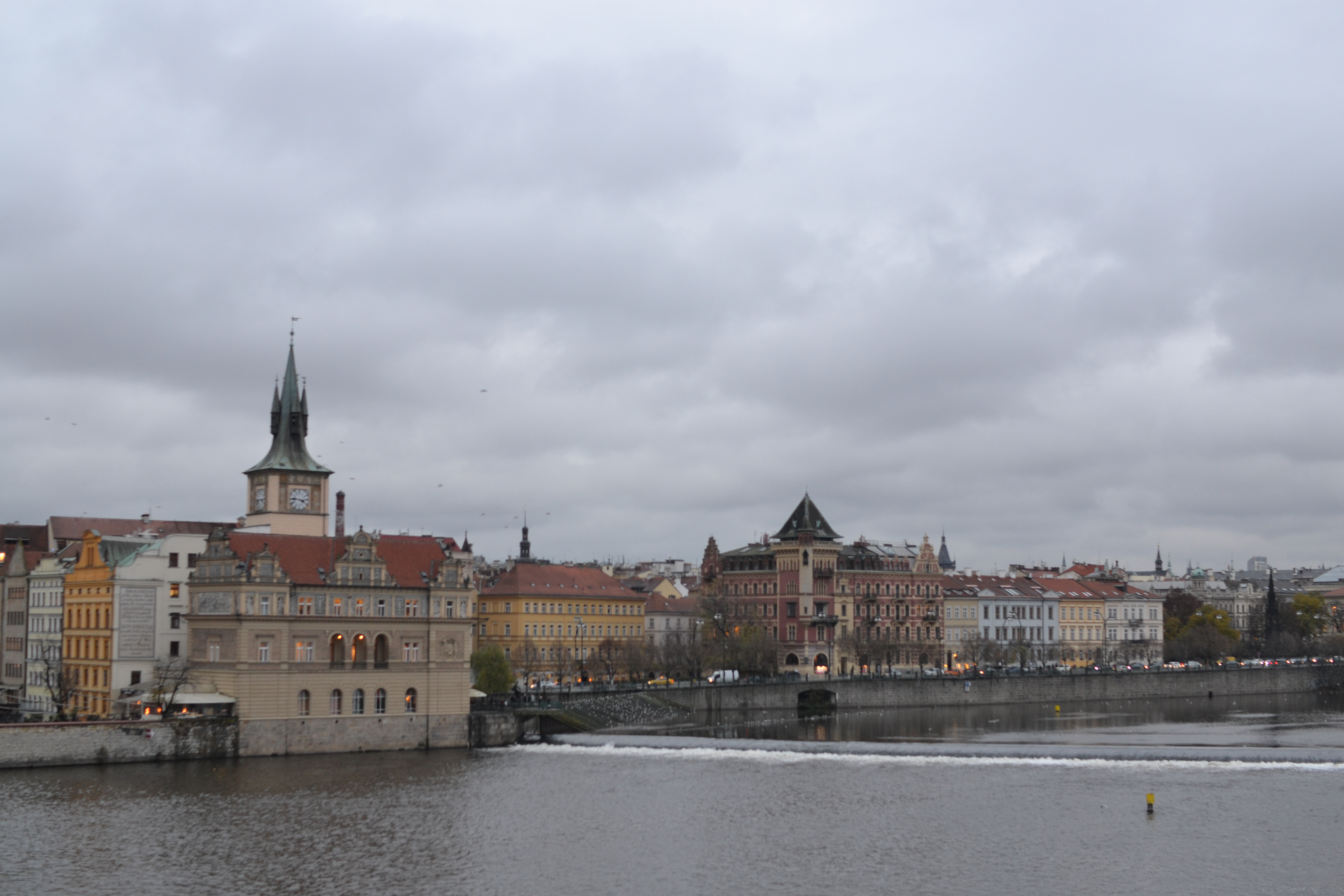 Avec un peu de retard pour cause de coucher tardif, voici la suite de mon voyage. Journée un peu mitigée. Je suis sortie le matin, le cœur léger en me disant qu’enfin, la pluie avait cessé. 5 minutes plus tard, rectificatif. Non seulement il y a du brouillard mais il bruine (fort même), il fait froid et il y a du vent. La totale en somme. J’avais résolu d’aller visiter le château, j’ai donc poursuivi sur ma lancée. A peine à mi-chemin, je suis entrée dans une des deux tours qui encadrent le pont afin de me réchauffer un peu. Le prix d’entrée est assez élevé pour le coin. Environ le prix de 3 pintes – oui, je convertis tout en pinte de bière puisque c’est le prix qu’on voit le plus souvent affiché ici. D’ailleurs, je vous conseille de visiter cette tour avant la première pinte de la journée car les escaliers sont très raides. En haut, magnifique point de vue sur la ville pour les plus chanceux, sur brouillard pour les autres. Idéal pour photographier les toits de Prague.
