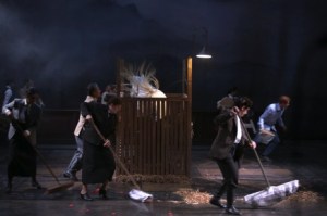La première chose qui m’a marquée quand le spectacle à commencé, c’est le décor, pour le moins imposant. Les costumes ne sont pas en reste et une musicienne fait des merveilles avec les percussions pour créer une ambiance sonore unique. Mais je n’étais pas au bout de mes surprises. Au fil des scènes, le décor est changé avec une dextérité impressionnante. J’ai beaucoup aimé ces changements d’ambiance parfois radicaux et la fluidité avec laquelle ils sont effectués. J’ai eu l’impression que c’était un véritable film qui se déroulait sous mes yeux. La mise en scène est époustouflante. Elle regorge d’idées, et j’ai aimé le déploiement de moyens, ça va de la petite trouvaille absolument géniale à la grosse machinerie : on en prend plein la vue. Je craignais un peu de trouver le temps long devant Macbeth, une pièce assez obscure et dont le côté fantastique ne m’emballe guère. Là j’ai trouvé les sorcières très réussies justement (mais TOUT est réussi !). Ariane Mnouchkine parvient à moderniser cette histoire et à l’intégrer parfaitement dans un univers contemporain. Vraiment très fort.