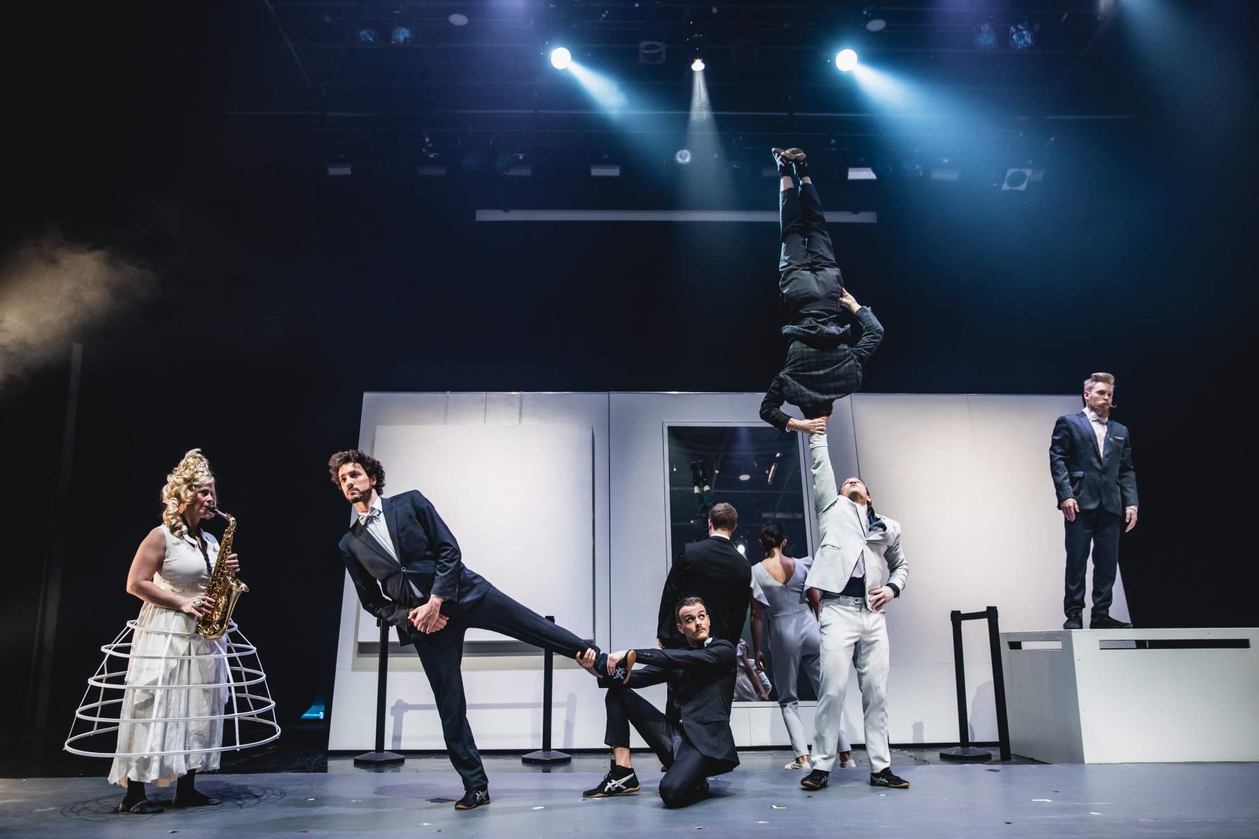 Que dire ? Voilà un spectacle que j’ai détesté de bout en bout. Une torture sans nom. Si je n’avais pas été installée pile au milieu d’une rangée bondée, je serais serais partie au bout de quelques minutes à peine. Alors on ne peut pas dire, il y a un réel travail d’écriture et quelques beaux numéro, malheureusement je n’ai pas du tout apprécié leur univers. La mise en scène faussement foutraque m’a exaspérée. Je suis hermétique à l’absurde qui s’avère être la base de spectacle, assaisonné d’une musique dissonante des plus agaçante. Tout ce que j’exècre réuni : youpi ! Il y a de belles acrobaties mais pas toujours bien mises en valeur, j’ai toutefois apprécier les numéros de jongle, roue allemande et barre russe. Malgré un spectacle très écrit et de haute volée, je suis restée totalement froide à cet univers qui m’a fortement fait grincer des dents.