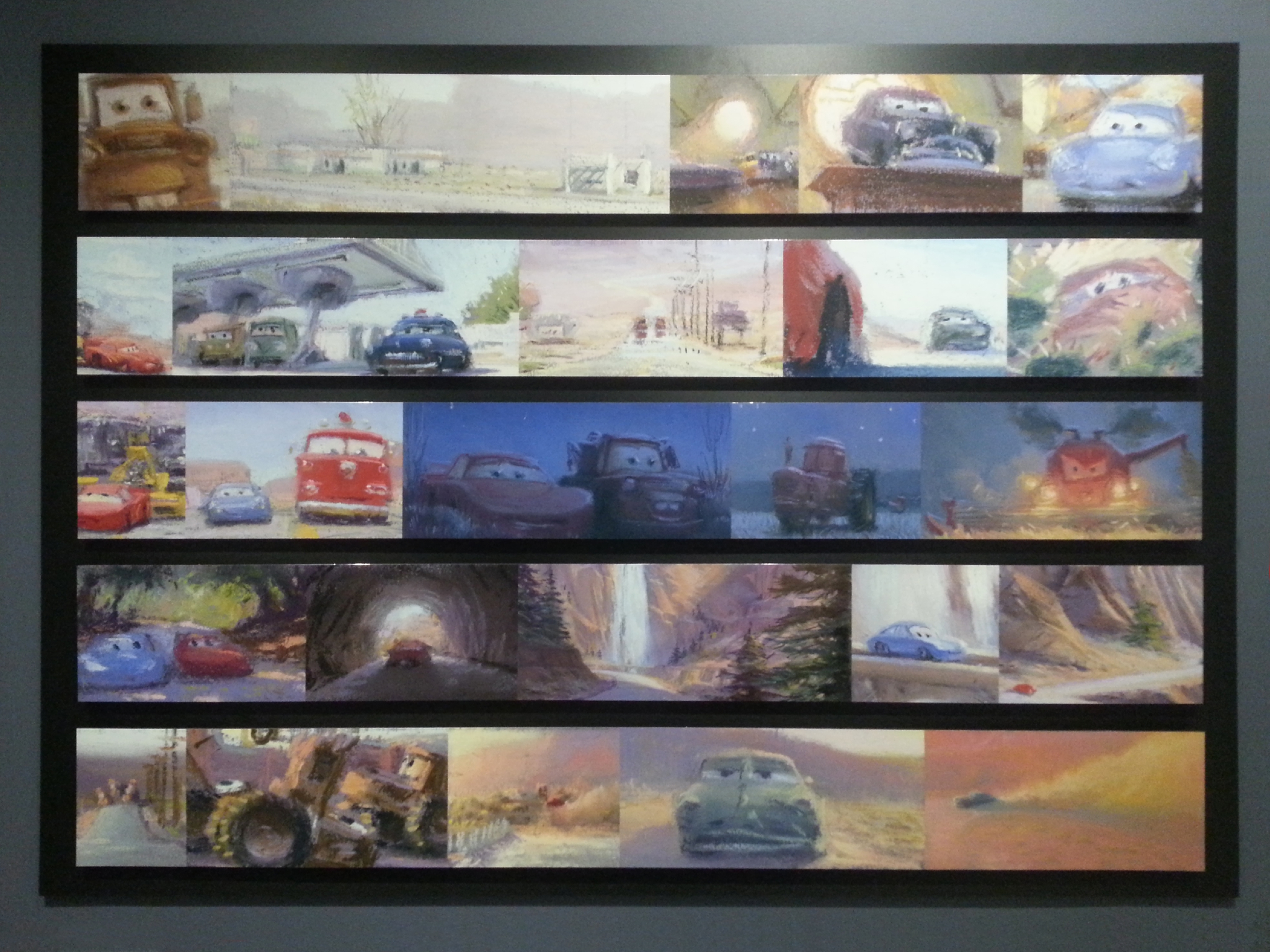 … mis à part la petite introduction à l’entrée, a-t-on croisé la moindre ligne de texte ? A-t-on vu une explication quelque part ? Sait-on au juste ce qu’on regarde ? Nous nous concertons, regardons autour de nous, mais l’évidence est là : les œuvres sont livrées à elles-mêmes. Une fois ce constat fait, notre enthousiasme en prend un coup. En effet, on aurait adoré en savoir plus sur toutes ces belles choses. Je me suis posé des dizaines de questions au cours de cette exposition : combien de temps prend un projet ? comment se passent les décisions autour du dessin d’un personnage ? quels sont les plus gros succès Pixar ? et d’ailleurs, Pixar, c’est naît comment et aujourd’hui, ça ressemble à quoi ? est-ce que le travail évolue d’un dessin animé à un autre ? et le passage au numérique, ça change quoi ? J’étais accompagnée de grands fans de Pixar mais même eux étaient loin d’avoir les réponses à toutes les questions qui fusaient dans nos esprits survoltés.