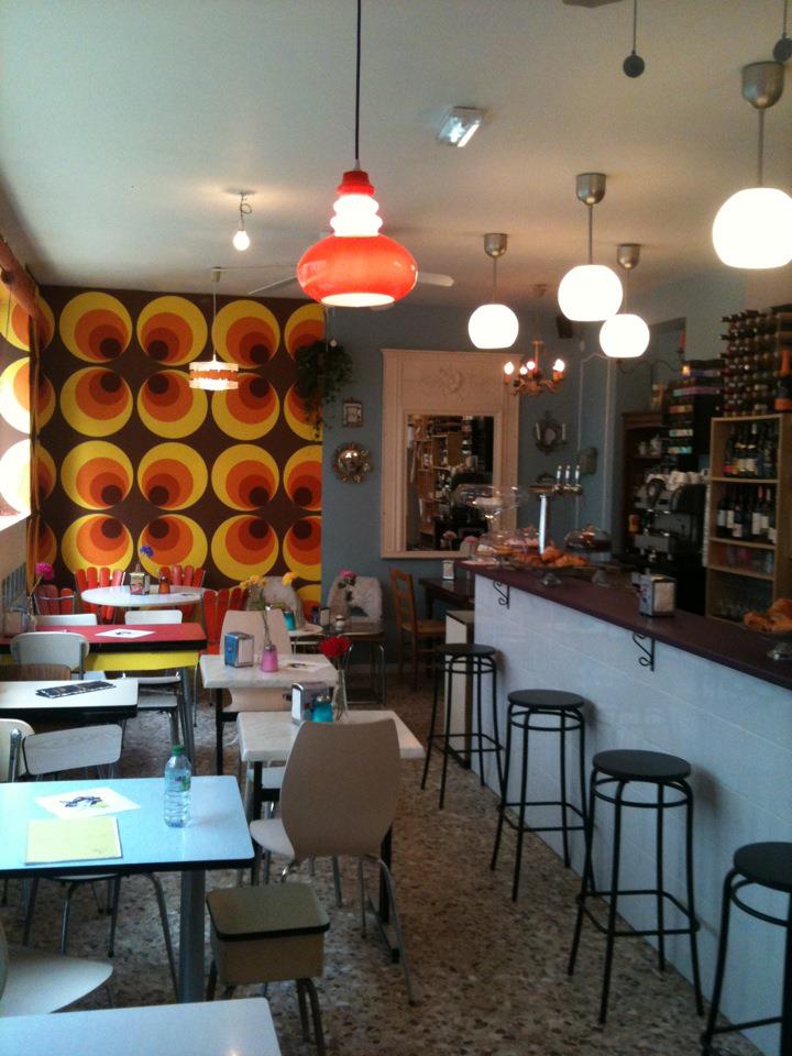 Le lieu n’est pas très vaste mais sur deux niveaux, le sous-sol permettant d’accueillir des groupes plus importants ou d’être plus au calme en cas d’affluence. La déco années 60 très kitch est aussi joyeuse qu’accueillante. Un univers coloré qui incite à la bonne humeur. J’y suis allée pour un brunch dimanche matin avec des amis. 6 formules sont proposées, à 18,50€ (ce qui est sensiblement le prix habituel à Paris), certaines classiques, d’autres plus surprenantes. Nous avons opté pour « l’Oncle Sam » : boisson chaude au choix et à volonté, jus d’orange ou de pamplemousse, tartines, croissant ou pain au chocolat, bacon, oeuf au plat, salade, pancake au sirop d’érable, fromage blanc au muësli. L’assiette ets copieuse et bien présentée (et la vaisselle vraiment chouette). Le moins qu’on puisse dire c’est qu’on ne ressort pas de table avec la faim au ventre ! Le service est très chaleureux, ce qui ne gâche rien à l’affaire. J’ai beaucoup aimé ce brunch équilibré et plein de saveurs (hum… ce bacon croustillant…), qui s’il cale bien ne donne pas l’impression d’avoir engouffré assez de graisse pour tenir 3 mois d’hibernation. J’a-do-re !!! Pour le reste de la carte, les prix proposés sont tout à fait abordables pour la capitale et les gâteaux font autant envie que les tapas. Un lieu très convivial où je compte bien revenir bientôt pour tester quelques tapas à l’apéro ! Courez-y vite !!!