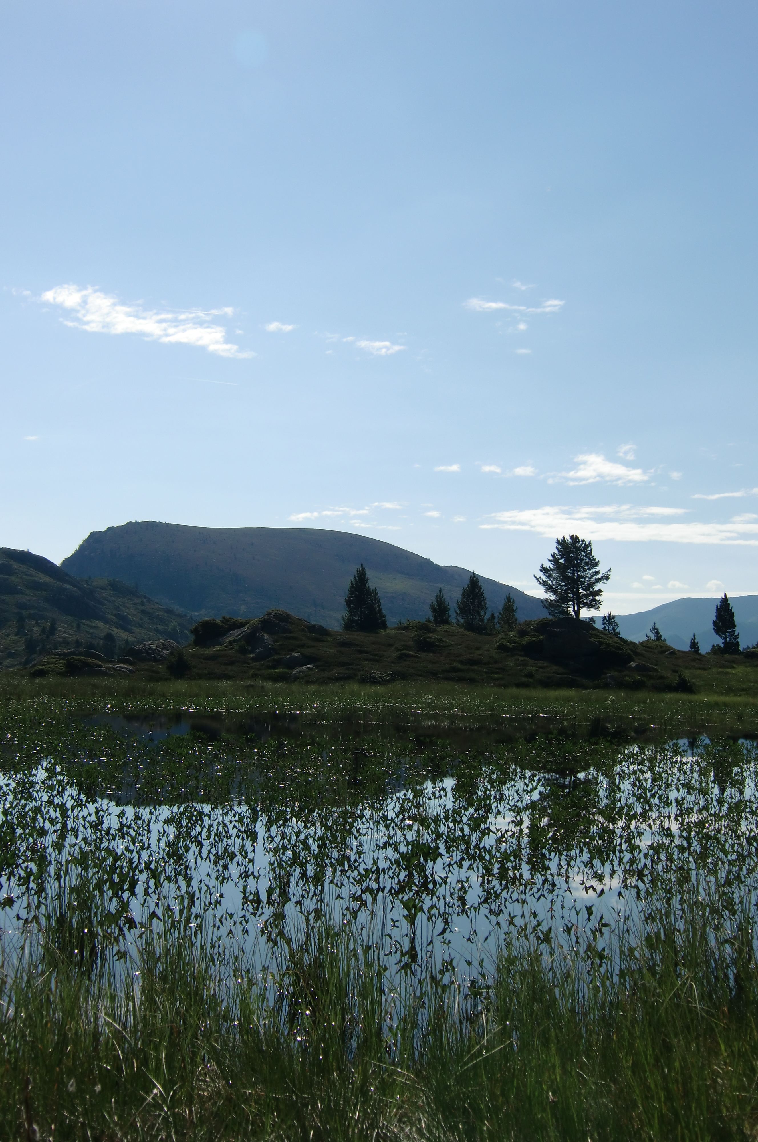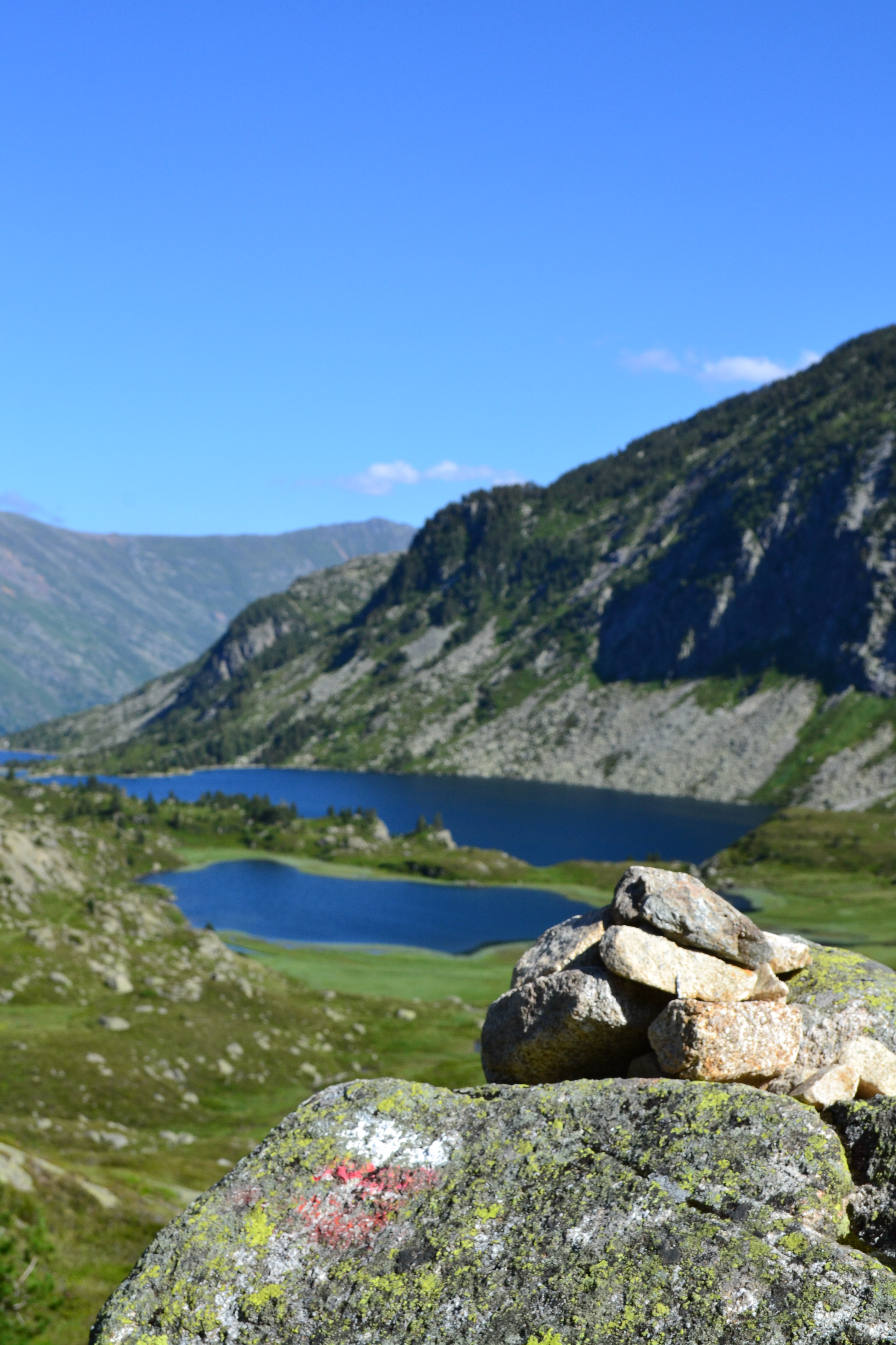 Les étangs de Bassiès se trouvent dans l’Ariège, on peut les atteindre par Auzat (commune sur laquelle ils sont situés) ou « Coumebière », au-dessus d’Aulus, sur la route du Col d’Agnes (qui rejoint Massat, mon chez moi). C’est cette 2° option que je vais vous présenter. On commence par monter environ une heure par des lacets en pente douce au bord desquels on peut observer de nombreuses fleurs de montagnes, croiser des vaches et humer l’odeur des oeillets. On atteint ensuite le Port de Saleix, d’où la vue dégagée est très belle. Ensuite, une montée un peu raide vous attend, courage, elle n’est pas très longue et c’est la seule difficulté du parcours. La première bonne surprise vient de l’étang d’Alate, au bord du chemin, idéal pour une petite pause et une baignade pour les courageux. Encore un peu de marche en traversée et…