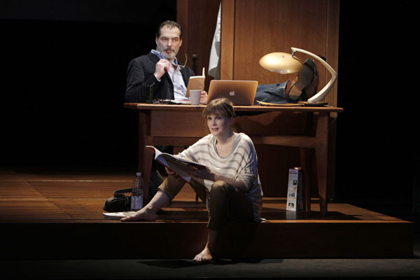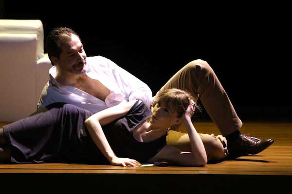 Adapté par Gérald Sibleyras, on peut découvrir ce texte au Théâtre Montparnasse dans une mise en scène de Christophe Lidon avec Samuel Labarthe et Isabelle Carré. Les décors sont extrêmement réussis, avec une mise en scène très inventive. Il y a notamment des jeux de lumière intéressants. Les deux acteurs restent en permanence sur scène, même lorsque leurs personnages ne sont pas sensée se croiser, les acteurs sont côte à côte. Ca marche très bien, on ne s’y perd pas (le récit marche essentiellement par monologues, ce qui fait gagner en clarté) et ça donne l’impression que les personnages continuent leur vie en dehors de l’histoire.