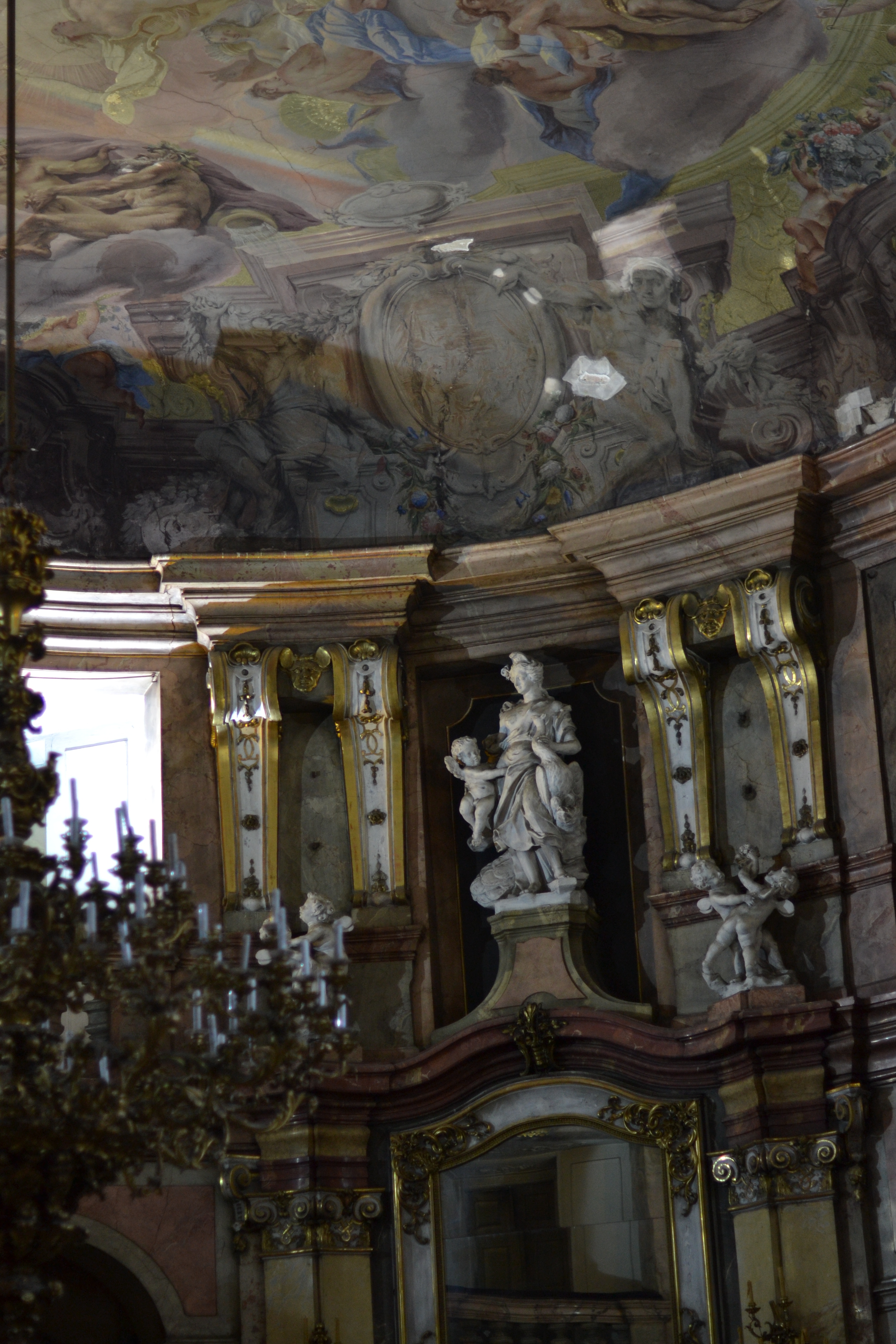 Après manger, fin de mes achats et je me dirige vers le Klementium, que je veut visiter depuis le début de la semaine pour sa bibliothèque baroque. La 1° fois, je n’avais pas trouvé l’entrée, je comprends mieux. Une est masquée par des travaux, une seconde est cachée après par une vente de billets pour des concerts est la 3° est une entrée de parking. J’avais du passer 10 fois devant sans comprendre par où on entrait… Dans le bâtiment, uniquement des visites guidées, en anglais. Malgré mon niveau plus que passable, j’ai réussi à presque tout comprendre. C’est vraiment pensé pour un public international. Nous étions très peu nombreux et la guide parlait d’autres langues. La visite était passionnante et notre guide très prévenante, j’ai regretté de ne pas pouvoir discuter plus avec faute d’oser me lancer avec mon anglais boiteux. La chapelle Miroir, très réputée, est un peu chargée à mon goût; avec des tons roses en prime. On traverse ensuite des bâtiments genre administration des années 60 pour arriver à la bibliothèque baroque. C’est à couper le souffle ! Et encore, il manquait beaucoup de livres, envoyés en Allemagne pour étude et restauration si j’ai bien compris. Les photos sont interdites, celle que je vous mets vient donc de l’office du tourisme. La tour, qui servait d’observatoire astronomique, offre une magnifique vue sur Prague. Si j’avais su, j’aurais fait autre chose le matin…