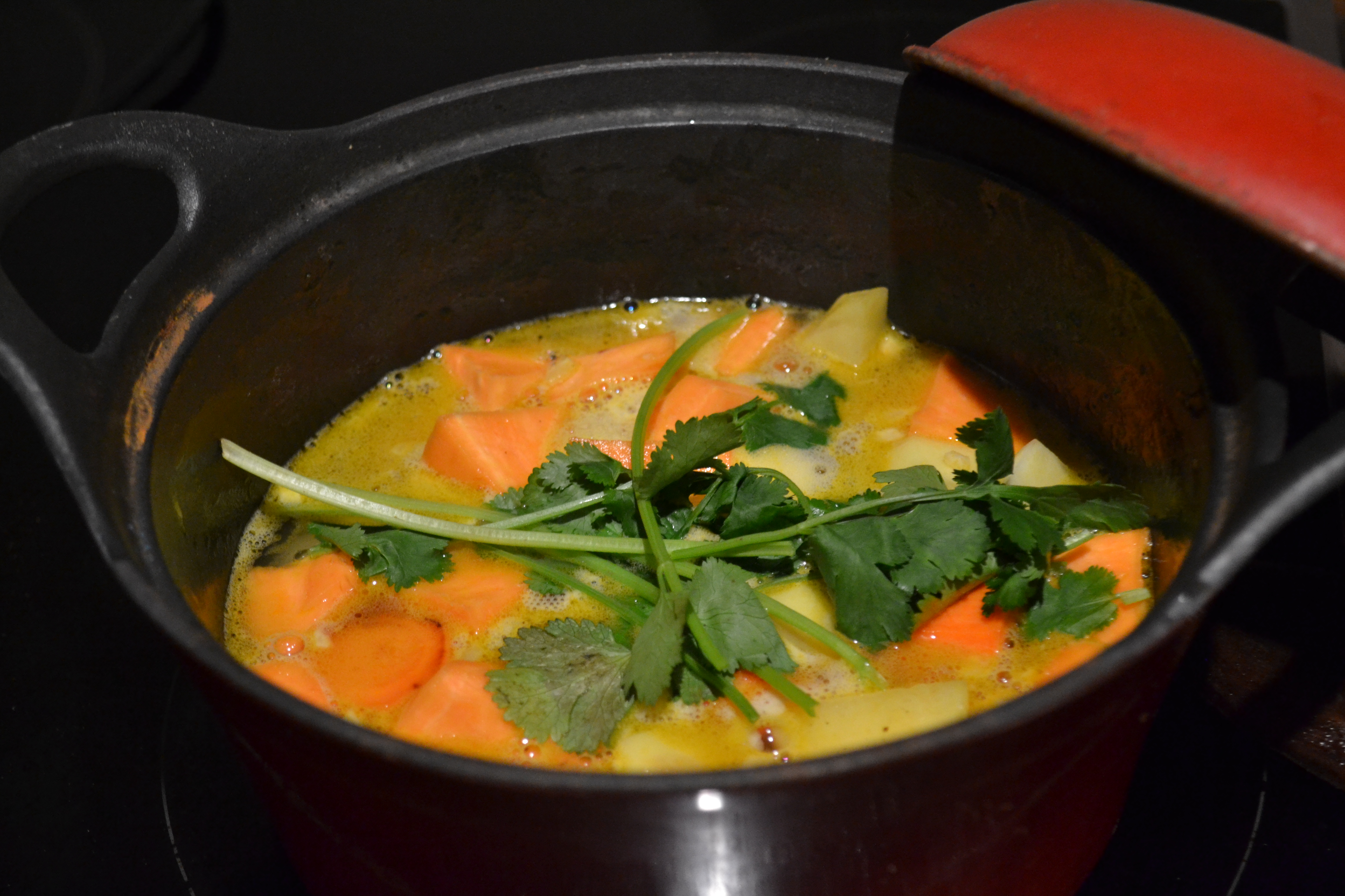 Ajoutez le lait de coco et les épices. Salez, poivre, mélangez bien. Faites réchauffer votre purée à feu doux avant de servir et saupoudrez de coriandre concassée.