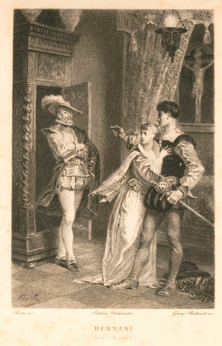 Dona Sol est promise à Don Ruy Gomez, mais elle aime le bandit Hernani et veut fuir avec lui. Mais Don Carlos, roi d’Espagne, lui aussi épris d’elle va découvrir leur amour et tenter de voler au brigand son amante. Une série de péripétie va s’ensuivre pour savoir qui des trois aura la main de la belle.